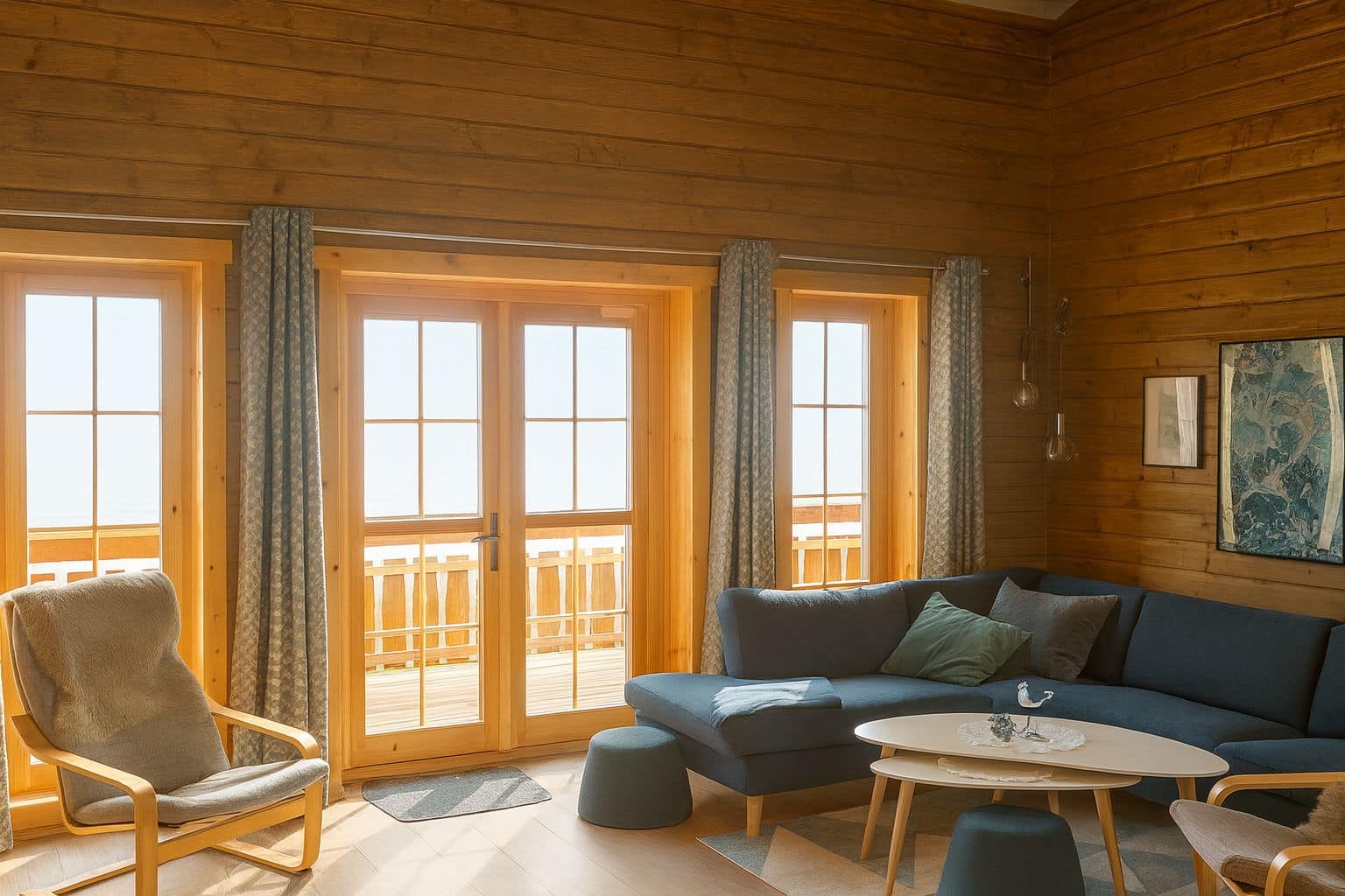 Darüber hinaus werden für dieses schöne und geräumige Holzferienhaus hochwertige wohnhausfähige Fenster mit einem 1,1 U.G.-Wert verbaut, die alle über eine so genannte Einhand-Dreh-Kipp-Funktion verfügen. In Hinblick auf den Innenausbau können in gewissem Maße auch Sonderwünsche berücksichtigt werden!