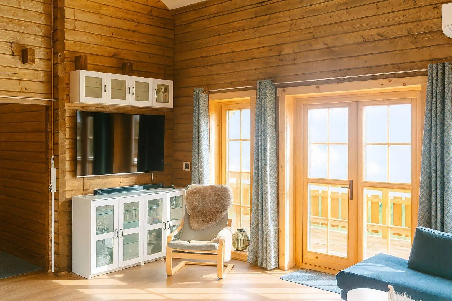 This sleeping loft measures 5.70 m x 6 m and is also very spacious with a maximum headroom of 1.90 m. The total usable area for the log cabin is 103 m², so it can also be used very well as a main house. Another highlight is the exterior door with 5-point locking, which not only meets the highest security requirements, but can also be designed to look as desired.