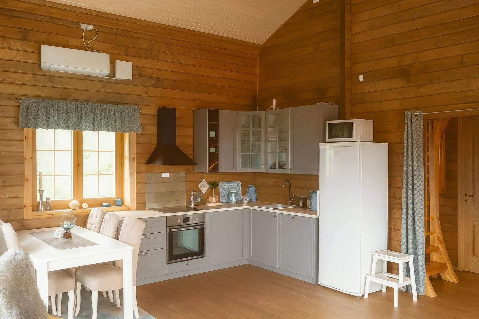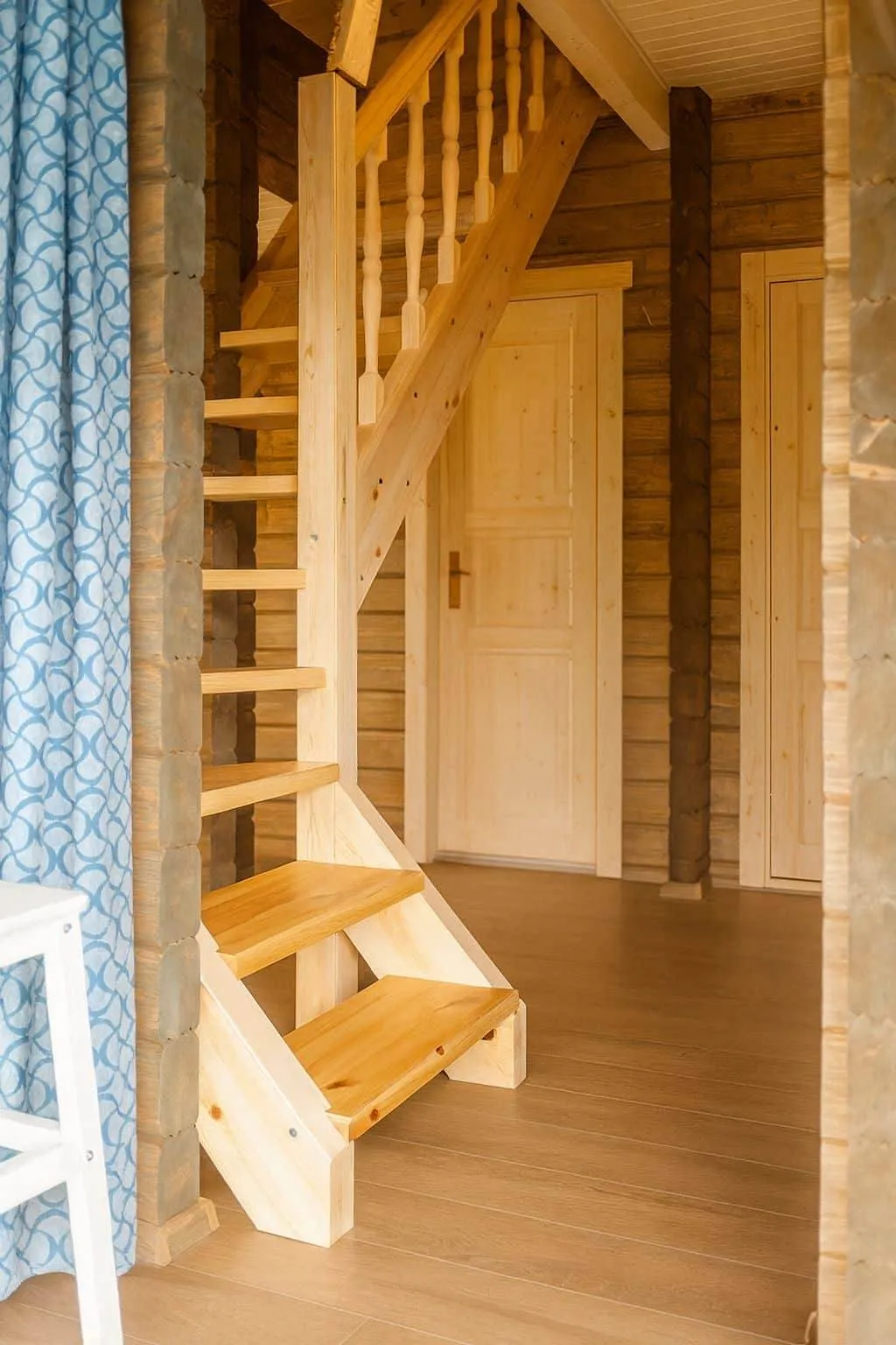 Our Elbe log cabin is available with either 70 mm or 94 mm thick logs. A highlight is the cozy sleeping loft, which is easily accessible via a 1/4 spiral wooden staircase with railings.