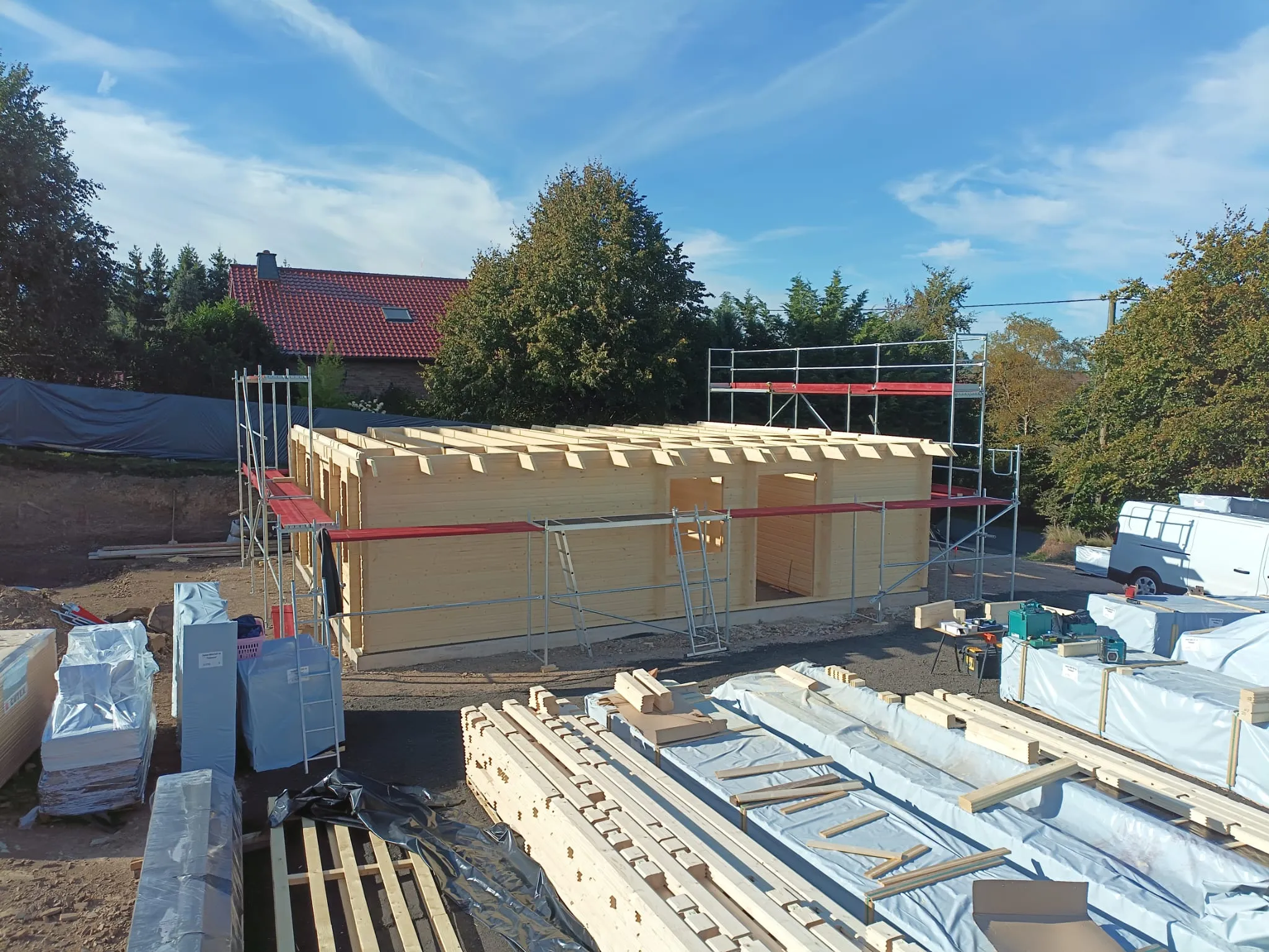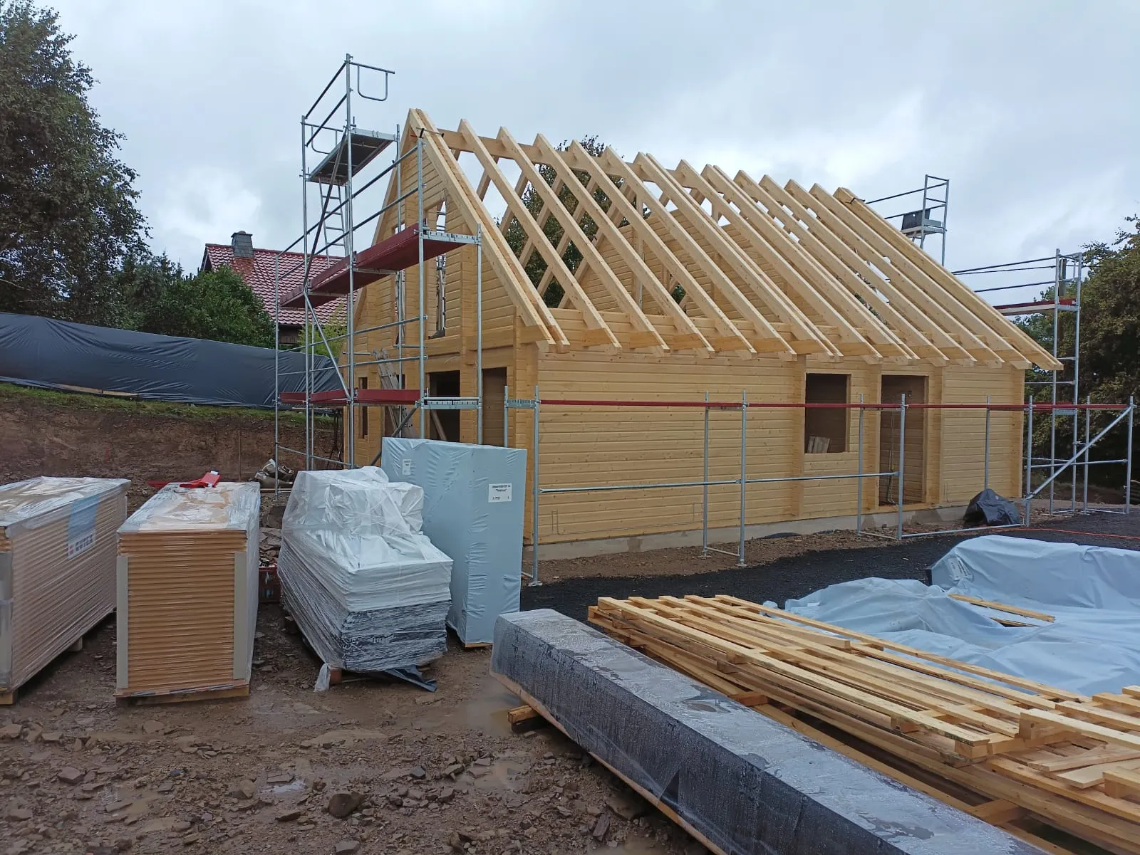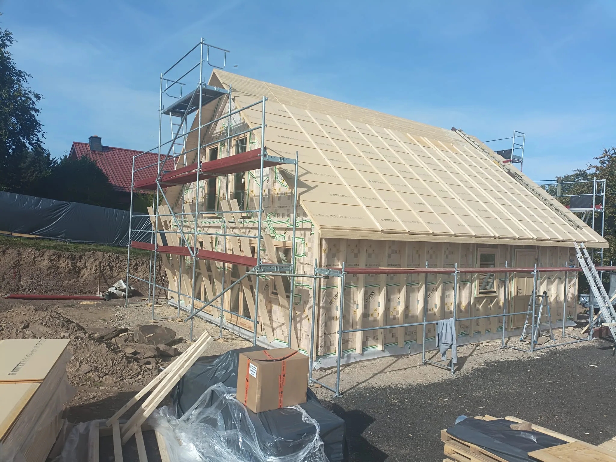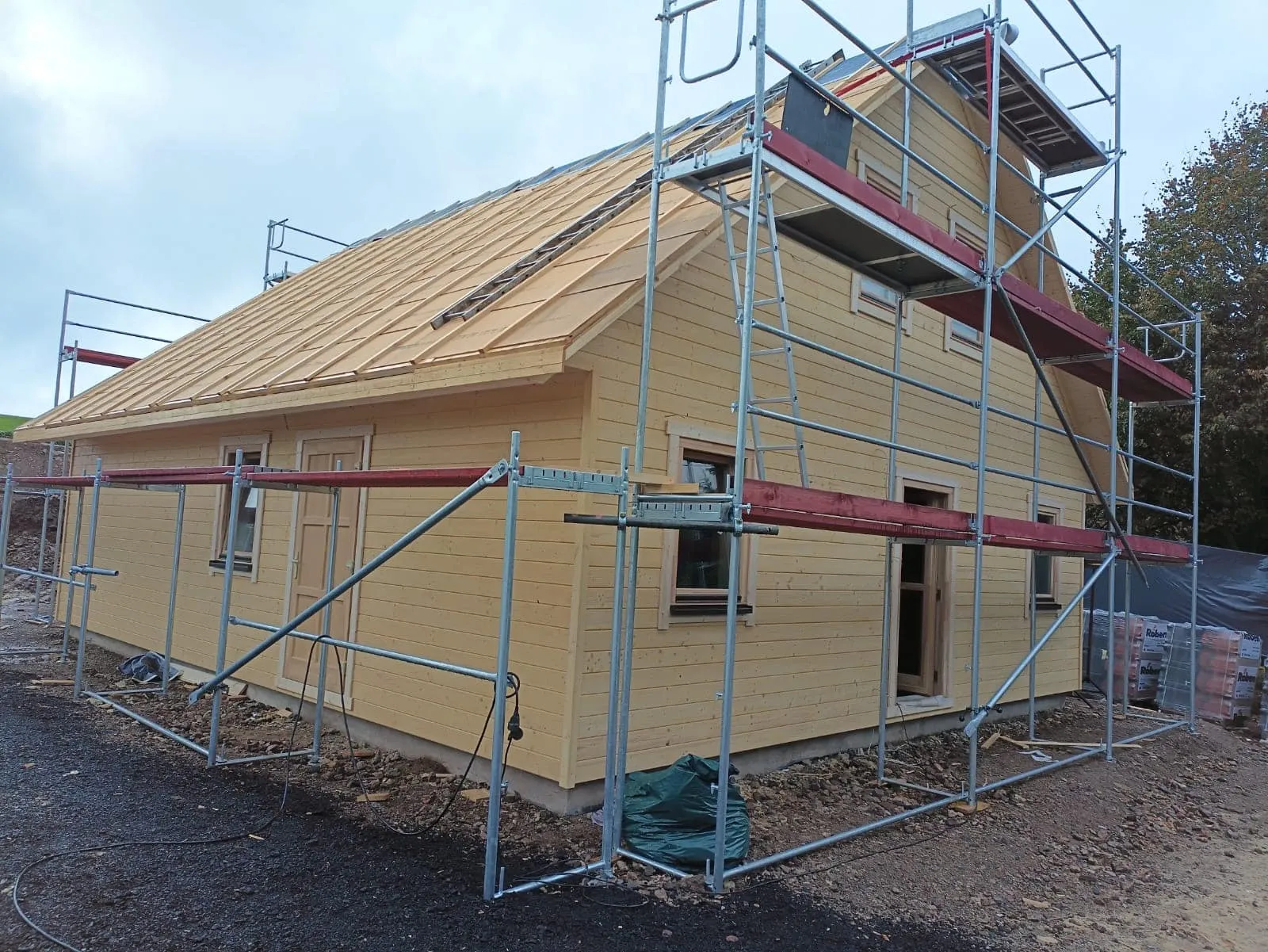Ein Haus wird mit Gerüsten und Gerüsten gebaut.