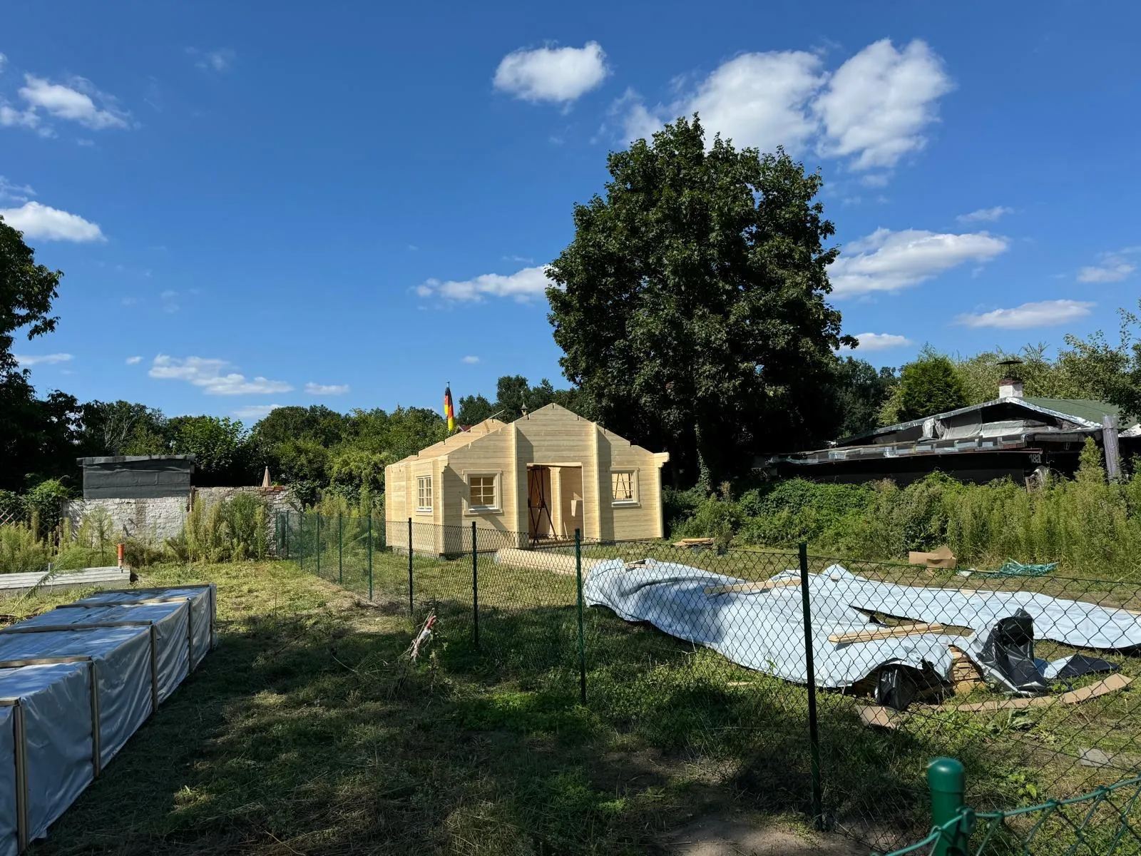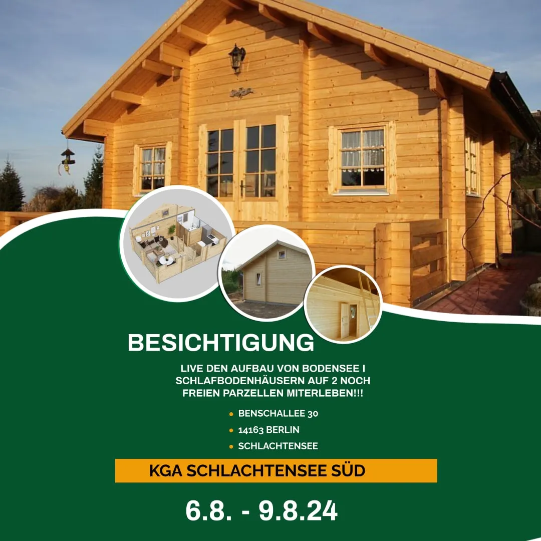 Vom 6. August bis zum 9. August hatten Sie die einmalige Gelegenheit, in der wunderschönen Kleingartenanlage im Bezirk Schlachtensee in Berlin die Montage von zwei Blockhäusern Bodensee 1 in 50 mm live mitzuerleben.