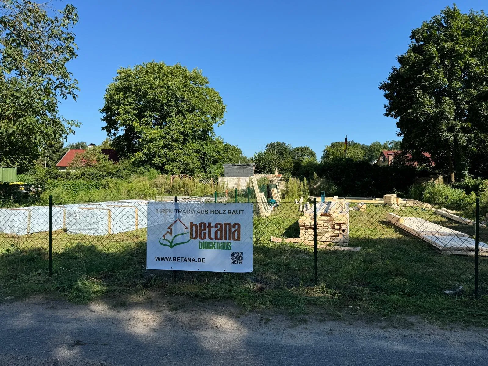 Zwei kleine Holzhäuser stehen in einem eingezäunten Bereich, umgeben von Grün. Auf dem Zaun hängt ein Schild mit der Aufschrift „Betana Blockhaus“ und einer Website-URL. Der Himmel ist bedeckt, und im Hintergrund stehen größere Bäume, was auf eine friedliche Atmosphäre hindeutet, die typisch für eine Kleingartenanlage wie Schlachtensee ist.