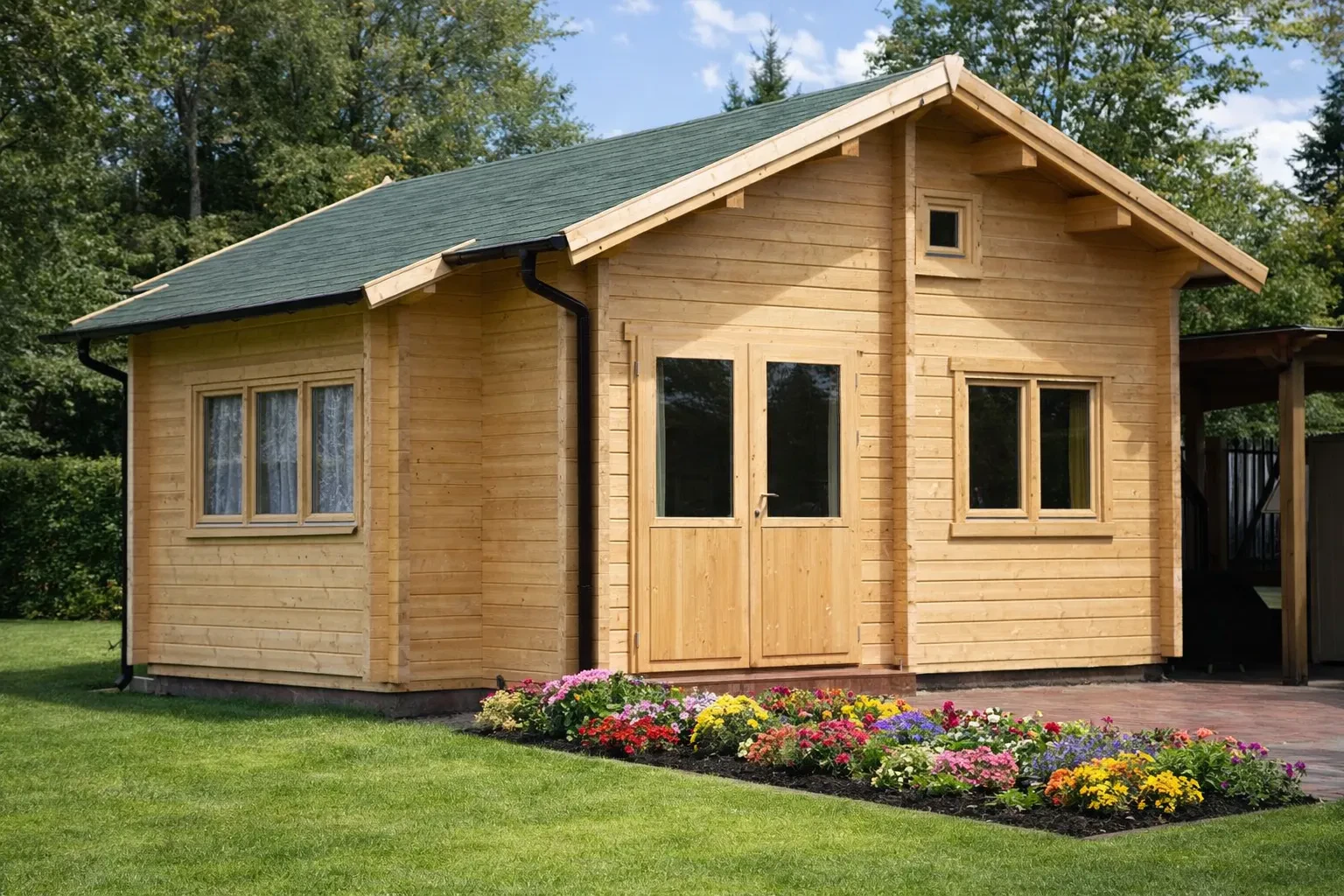 Weiterhin können natürlich auch individuelle Wünsche, Änderungsanliegen oder sinnvolle Upgrades wie hochwertigere Fenster und Außentüren umgesetzt werden, so dass sich ein persönliches Gespräch mit unseren Experten lohnt. Übrigens: Eine Veranda ist optional ebenfalls erhältlich, allerdings wird dadurch die Grundfläche auf knapp 33 m² erhöht. In kleinen Gärten ist dieser Holzbungalow auch ohne optionale Veranda möglich!